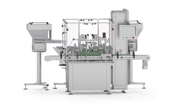 • В зависимости от опции имеются два отдельных блока подачи колпачков, они могут устанавливать и закрывать винтовую крышку, одновременно забивая пробку.